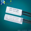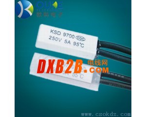 KSD9700型熱保護器是由導熱PBT外殼或金屬外殼、焊有銀合金觸點的雙金屬元件、導電支架、絕緣固定座、靜觸片及耐熱導線等元件組成。全封閉的結構能使元件免受灰塵或雜質的污染,防止漆液的滲透及外力的損壞。由于外殼是金屬導電體,在使用時配置有導熱且耐溫的絕緣套管。電流通過有阻抗的雙金屬元件,遇非正常工作時,隨電流增大或周圍溫度升高至設定溫度值時,雙金屬元件迅速動作,打開觸點,切斷電路。當裝置冷卻到安全工作溫度時,觸點自動閉合,恢復正常工作狀態。廣泛應用于單相、三相電機由于過載、堵轉等非正常工作狀態下引起的電機過熱保護,也適用于扼流線圈、螺旋真空管以及變壓器等一般電器的過熱保護和溫度控制。